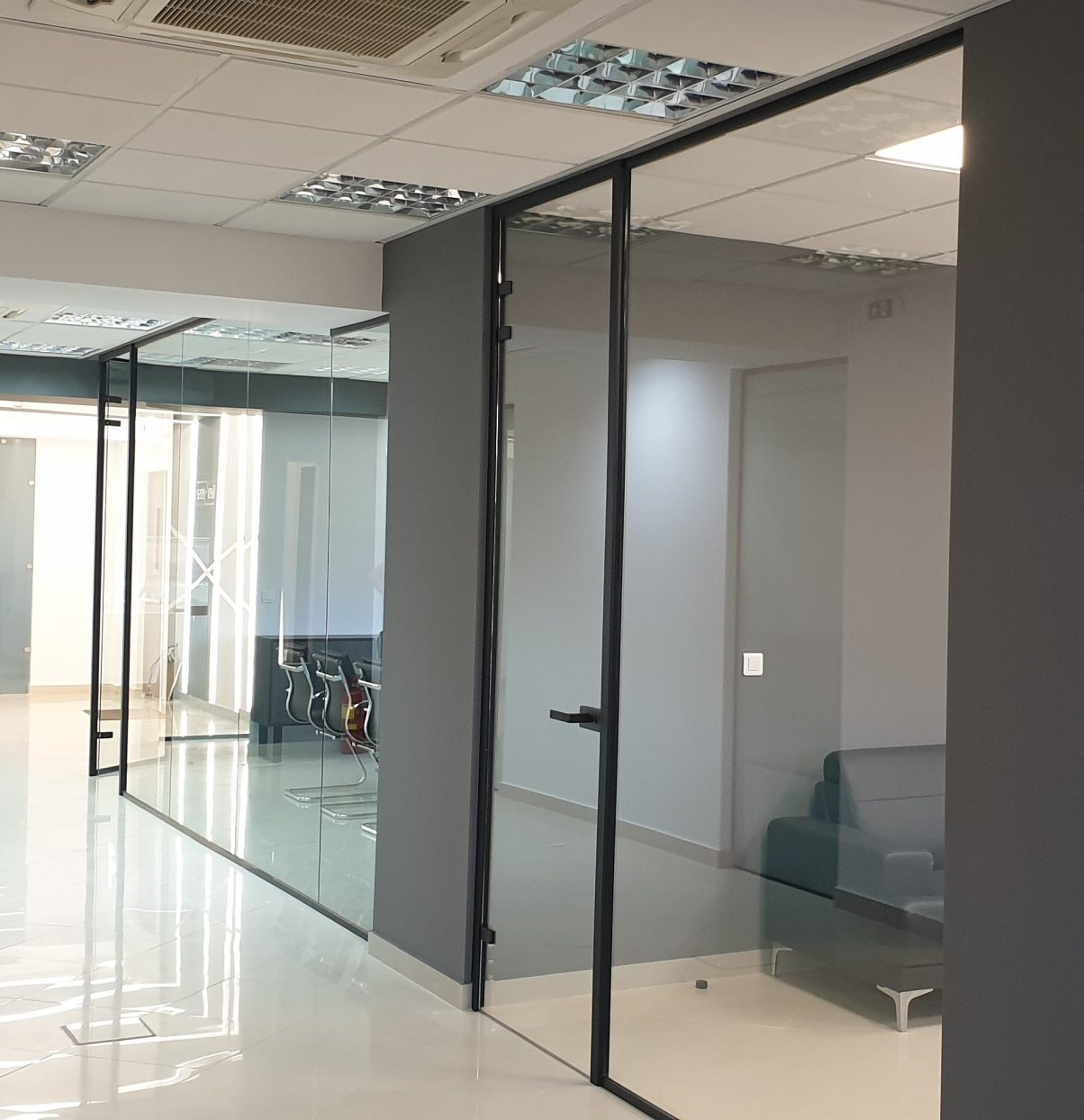 Τα γυάλινα διαχωριστικά αποτελούνται περιμετρικά από προφίλ αλουμινίου, ηλεκτροστατικά βαμμένο σε χρώμα της επιλογής σας και υαλοπίνακες ασφαλείας είτε διάφανους για περισσότερη διαύγεια και φωτεινότητα είτε ημιδιάφανους για περισσότερη ιδιωτικότητα.